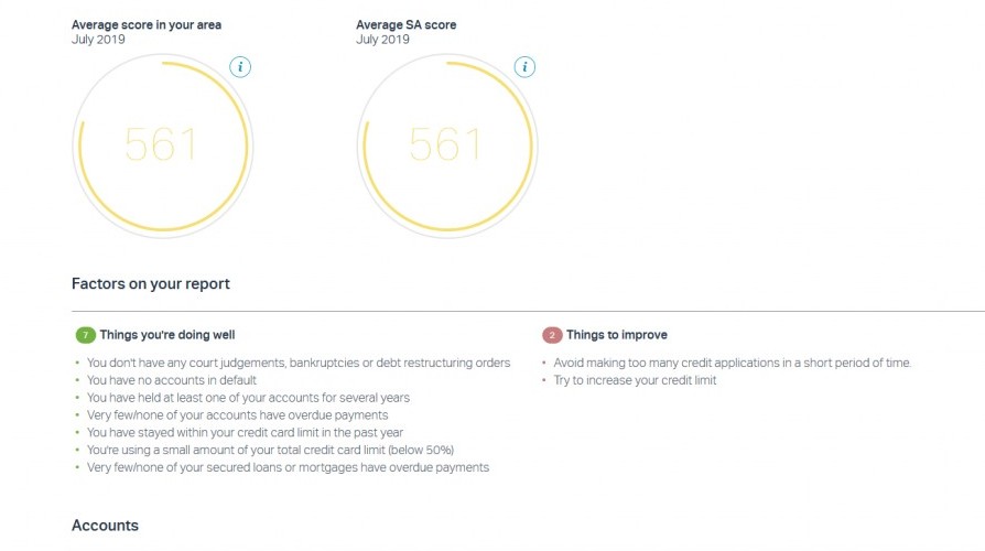 In main area of the menu they also give you the average credit score of the country as well as the average score in your geographical area. This give you an idea of how you stack up against other South Africans.